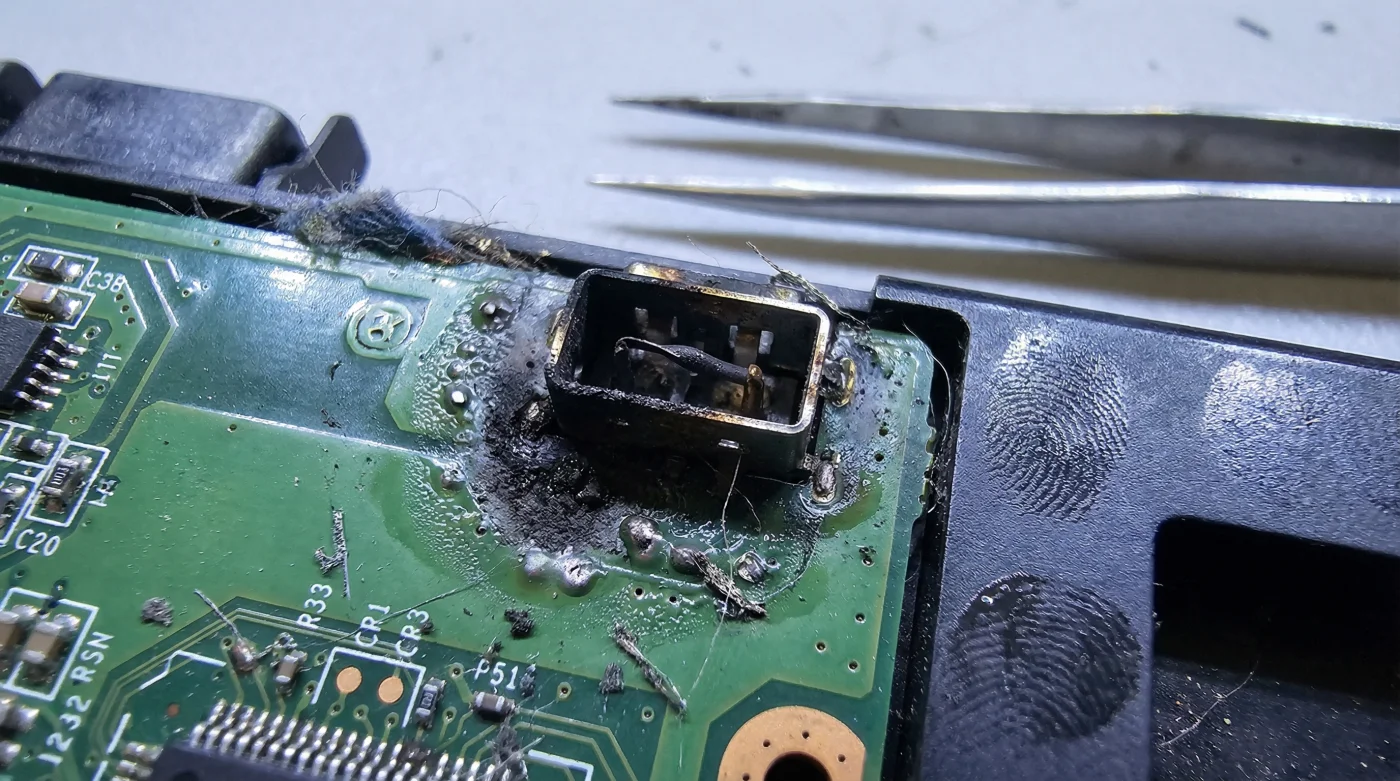 Cuando conectas un cargador falso, a menudo ese pin central es solo un trozo de metal inútil, o simplemente carece del microcircuito interno (una resistencia específica) que envía la firma correcta. Tu laptop, esperando un saludo amable y estructurado, recibe de golpe un torrente de voltaje crudo directamente en el chip de control de carga (el KBC o Super I/O). Al no haber moderación, el resultado es un cortocircuito que funde literalmente las pistas de cobre de tu placa base.