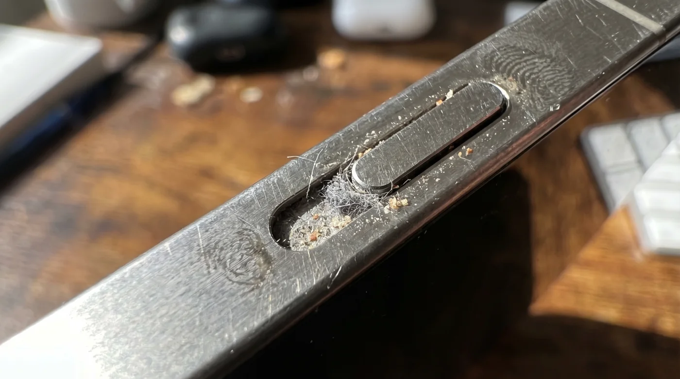 Sientes la fría textura del titanio grado aeroespacial resbalar por tu mano. Al presionar el lateral, esperas esa respuesta háptica seca y precisa que justifica un equipo de casi 30,000 pesos. En su lugar, el pulgar presiona contra una resistencia pastosa y muerta. No hay clic. Solo un ligero sonido sordo, como si apretaras un bloque de plastilina. El borde biselado del nuevo sistema de estado sólido ha capturado cada microfibra de tu bolsillo, formando una masilla densa y oscura en la ranura micrométrica que rodea el actuador. Esa acumulación no es solo suciedad estética superficial; es una barrera física concreta que está ahogando el sensor de presión capacitivo de tu equipo, aislando la placa de titanio del motor de vibración interno.