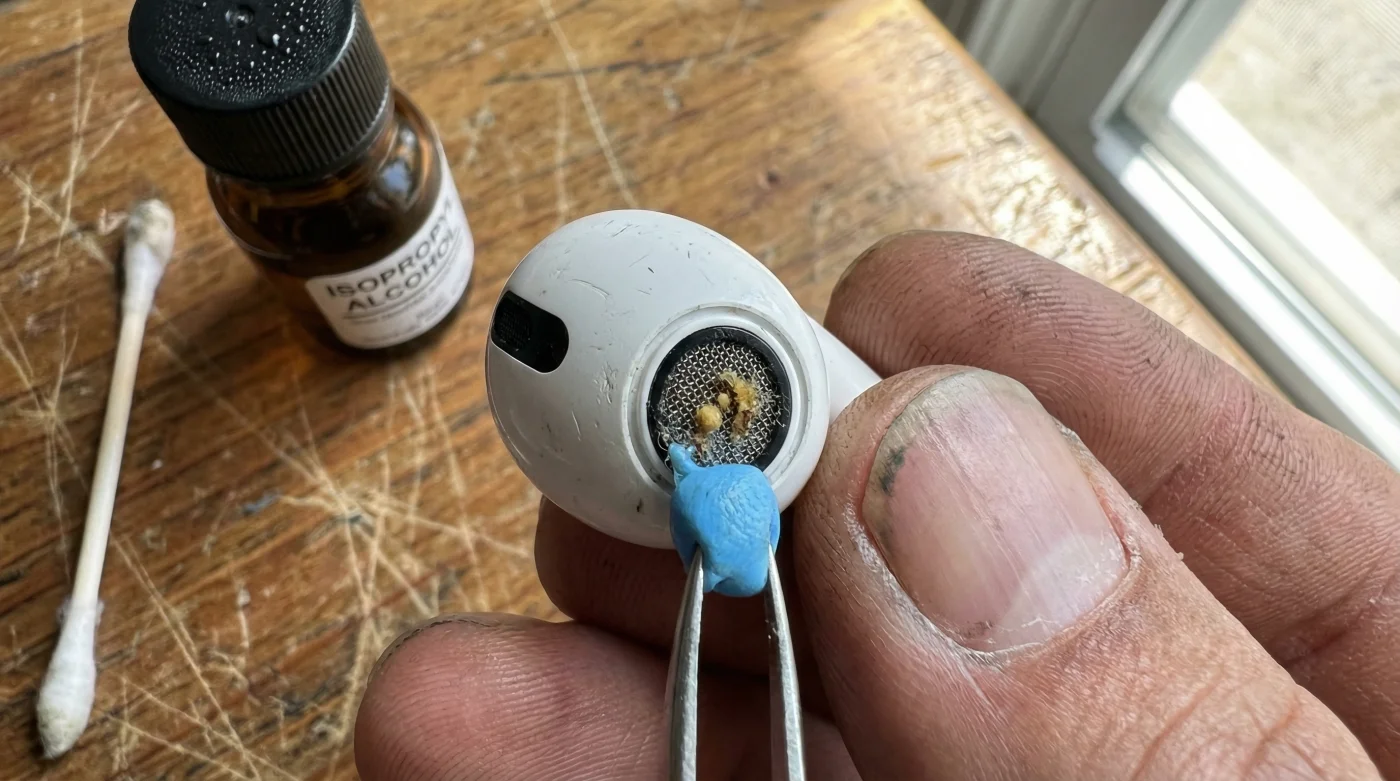 La fricción de los hisopos de algodón solo empeora esta tragedia. Las fibras microscópicas del algodón se desprenden y se enredan en los finos poros metálicos de la rejilla. Estás, literalmente, tejiendo una bufanda sobre un sensor diminuto que necesita captar las variaciones más sutiles del aire. Por eso, cuando activas el Modo Transparencia, escuchas un zumbido estático; el micrófono está luchando por escuchar a través de una pared de suciedad calcificada.